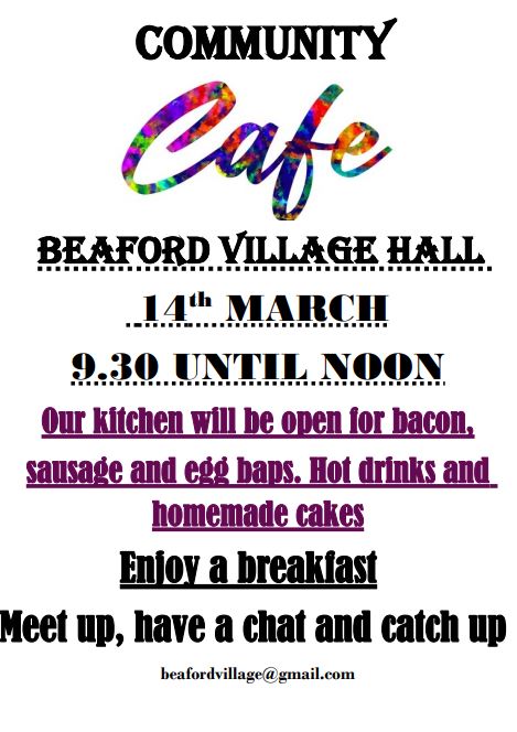 Saturday 14th March – 6pm until Late – Quiz Night – We’re delighted to announce that we’re holding a quiz night that will be hosted by the ever-popular Anita. Bar open from 6pm, quiz starts at 7pm. £3.00 per per person, maximum of six players per team. Come along as a team or join others to make up a team (we can accommodate you if you are a smaller team or an individual player). Prizes for the top three teams. Feel free to bring your favourite snacks, or enjoy some from the bar. Call Jo on 01805 603008 or email beafordvillage@gmail.com to book your space.