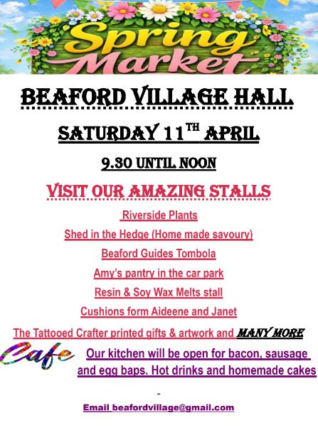 Saturday 11th April – 9:30am until Noon – Spring Market & Cafe – An opportunity for you to treat yourself to a delicious breakfast bap, hot drink and/or home baked cake from our kitchen. We’ll have many stallholders for you to browse.: Booked so far…. Riverside Plants are back ; Shed in the Hedge with her lovely baked goodies; Cushions stall; Guides tombola; Lindas cards; The Tattooed Crafter designed and printed items. Tracey with her knitted crafts., Resin Art & wax melts, Stained Glass, Amelia Loves Ceramics, Amys Pantry will be in the car park ; Torrington Commons fundraiser, Fused glass gifts .